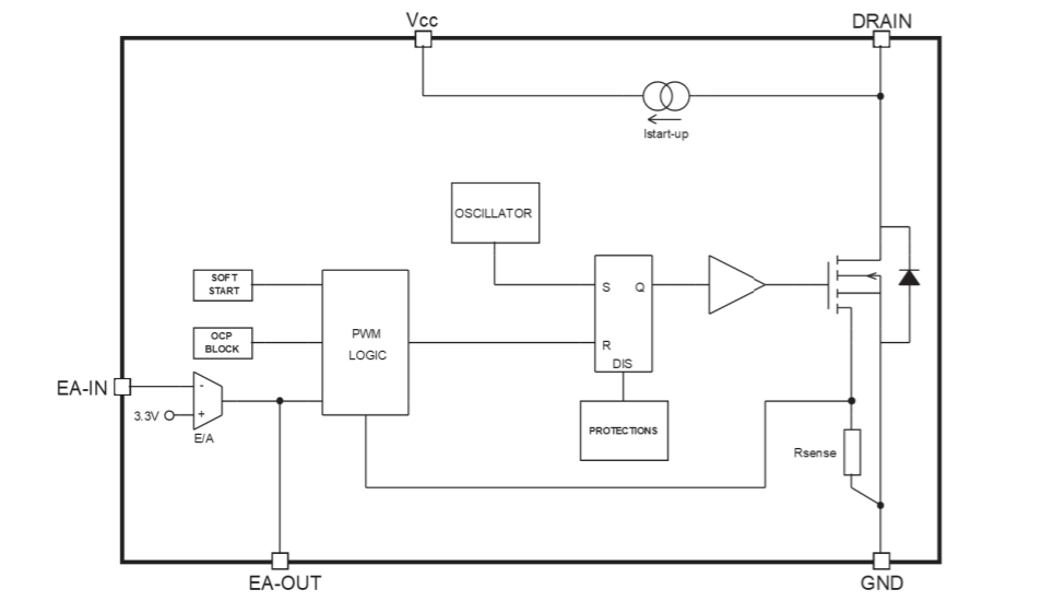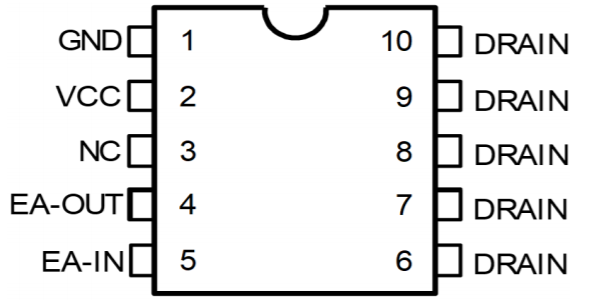 VIPer122系列器件采用10引脚的封装方式,包括:1个GND、1个VCC、1个NC、1个EA-OUT、1个EA-IN和5个DRAIN。其中,内置高压开关启动偏置电流来自DRAIN。