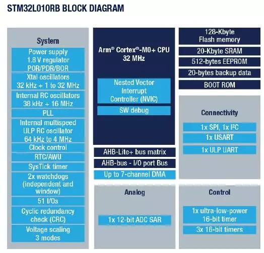 STM32L0x0 内置高达 128 KB 的 Flash、高达 20 KB 的 RAM 和高达 512 字节的片内 EEPROM。